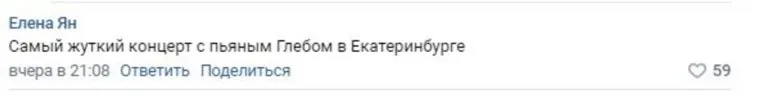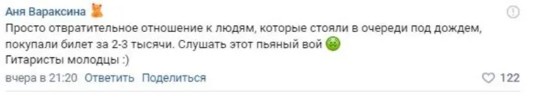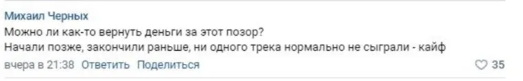 «Концерт ужасный просто. Стояли под дождем около двух часов, люди стояли в лужах у сцены, чтоб послушать пьяный ор! Даже 30 минут концерта не простояли и уехали, слушать было противно. Уважение к „артисту“ упало до уровня его уважения к фанатам. Две-три тысячи рублей за билет, чтоб посмотреть на тело, которое даже сидеть самостоятельно не в состоянии. И предлагают сходить на перенос концерта в другое число. Желания нет вообще, как исполнителя его даже слушать продолжать не собираюсь», — заявила фанатка.