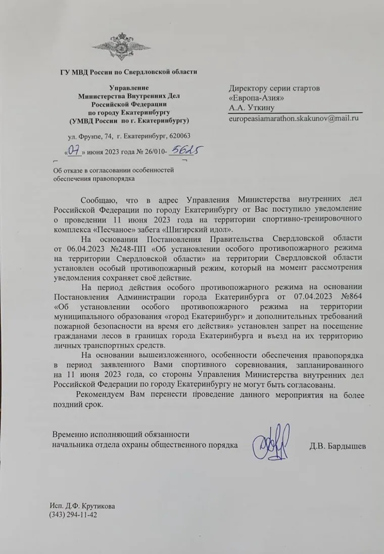 Екатеринбургская полиция запретила горожанам бежать в честь Шигирского идола в июне. Документ