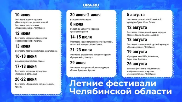 10 июня пройдет фестиваль водного туризма «Айские притесы» в долине реки Ай на площадках арт-парка «Большие притесы», экстрим-парка GRIFON и на Майской поляне. В этот же день в Челябинске пройдет фестиваль ретро-техники «Машина времени». В День России, 12 июня, челябинцев и гостей ждут на фестивале народного творчества «Русский хоровод» на Слюдоруднике в Кыштыме.