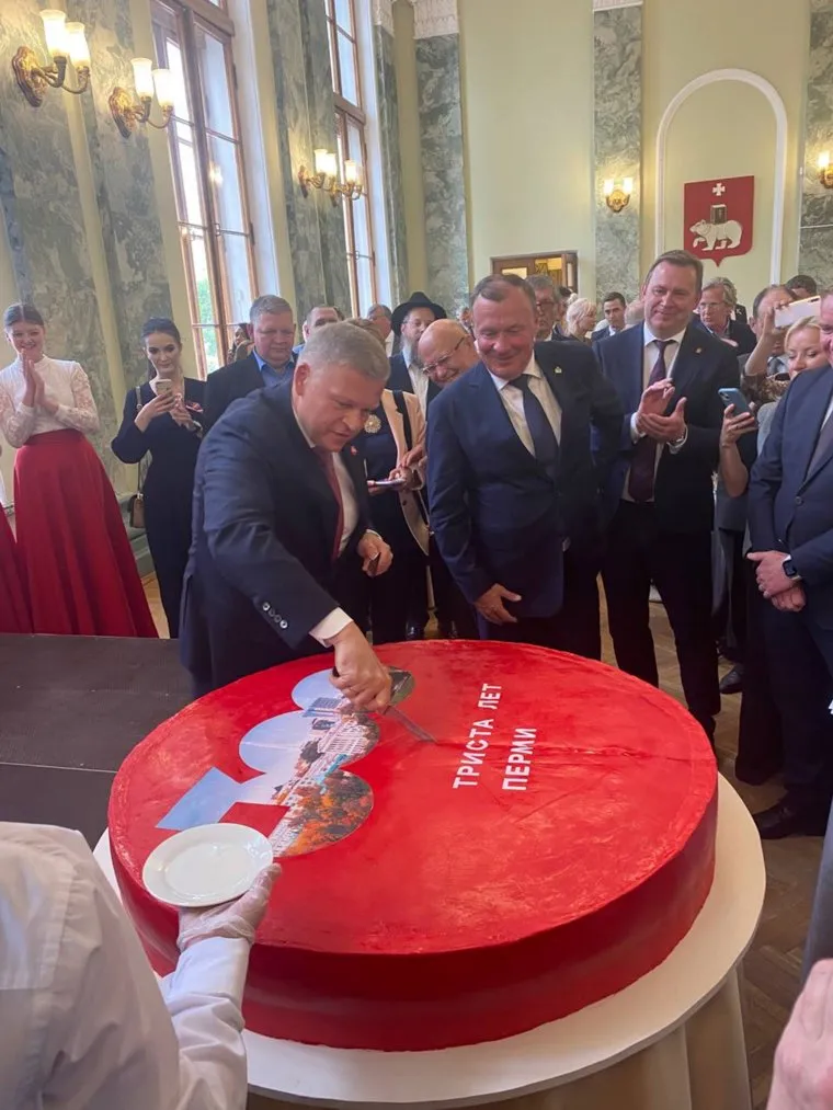 17:03 Глава Перми на приеме разрезал огромный торт, посвященный 300-летию города, и угостил присутствующих.