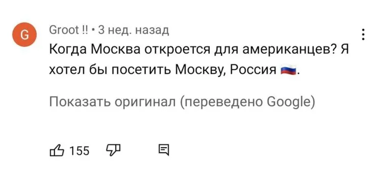 Зритель канала Andrew Vo назвал Москву чистой и уютной европейской столицей. «О России и русских на Западе много лжи», — отметил он. Американец Grott! задался вопросом, когда появятся рейсы между Россией и США. У него появилось желание посетить Москву.