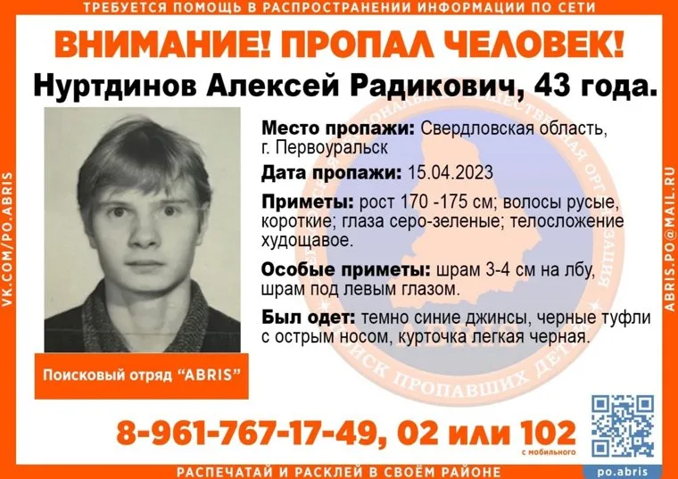 «Внимание, пропал 43-летний Алексей Нуртдинов, у него есть шрам на лбу и под левым глазом. Он потерялся 15 апреля», — говорится в сообщении отряда Abris в соцсети «ВКонтакте».