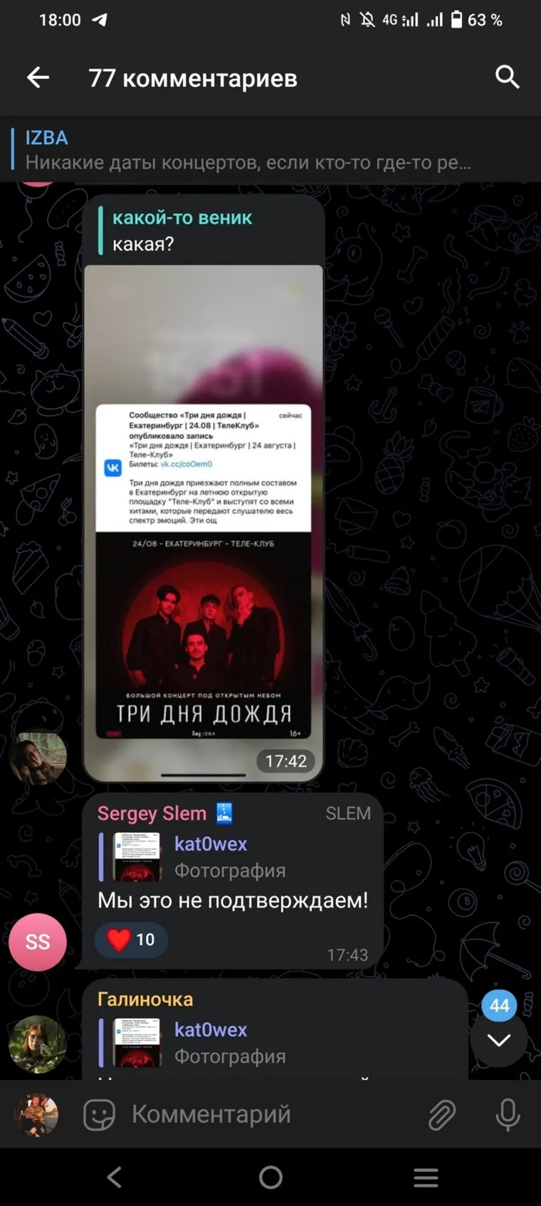 «Никакие даты концертов, если кто-то где-то рекламирует, и вы не видели этого в этой группе или группе ТДД, не являются правдой», — заявили представители группы в telegram-канале IZBA и приложили скриншот, где указано, что «Три дня дождя» выступят в Екатеринбурге 24 августа. Однако позже скрин из записи удалили.
