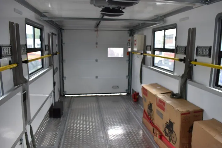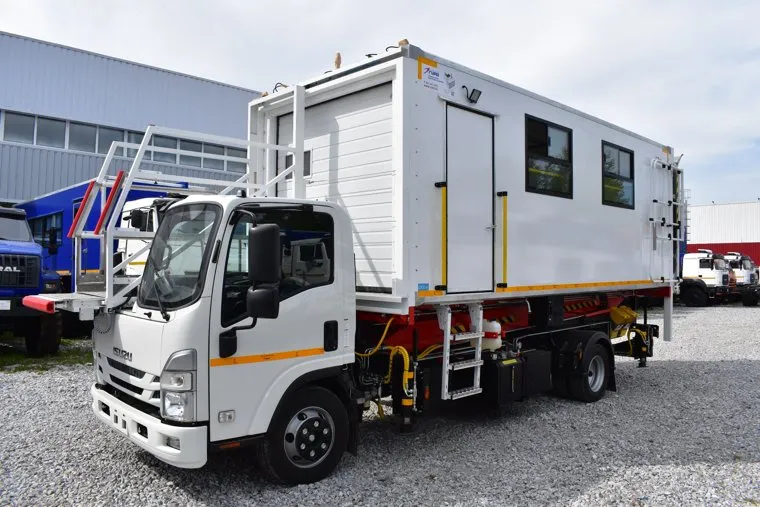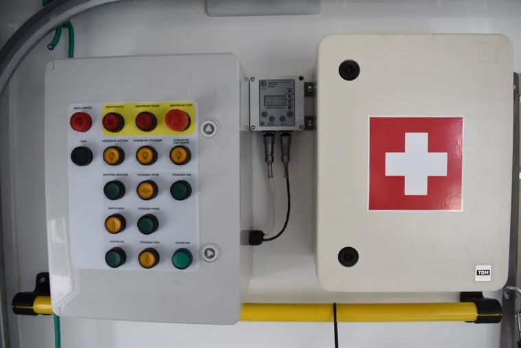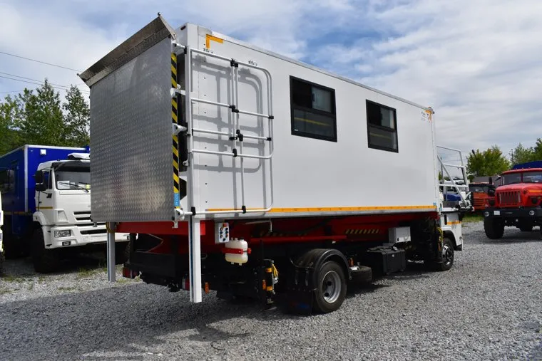 Управлять работой амбулифта можно из двух точек. Один пульт находится внутри фургона, второй — в кабине водителя. При подъеме и опускании фургона срабатывает звуковой сигнал. Кузов спецтехники изготовлен из сэндвич-панелей собственного производства по бескаркасной технологии и рассчитан на пять мест для пассажиров и на два места для сопровождающих лиц.
