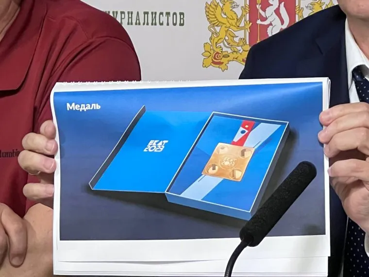 «На базе „Дома журналистов“ прошла пресс-конференция, на которой ректор УрФУ Виктор Кокшаров продемонстрировал дизайн золотой медали для спортсменов на Международном фестивале. Награды будут выпускать квадратной формы», — сказал корреспондент агентства.