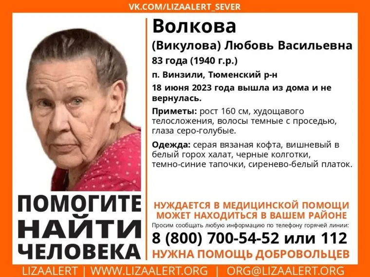 Тюменское отделение «Лизы Алерт» просит водителей, осуществляющих поездки в ночь с 18 на 19 июня в поселке Винзили, предоставить записи регистраторов для поиска 83-летней Любови Волковой (Викуловой) с потерей памяти. Просьбу о помощи поисковики разместили в своей группе в социальной сети «ВКонтакте».