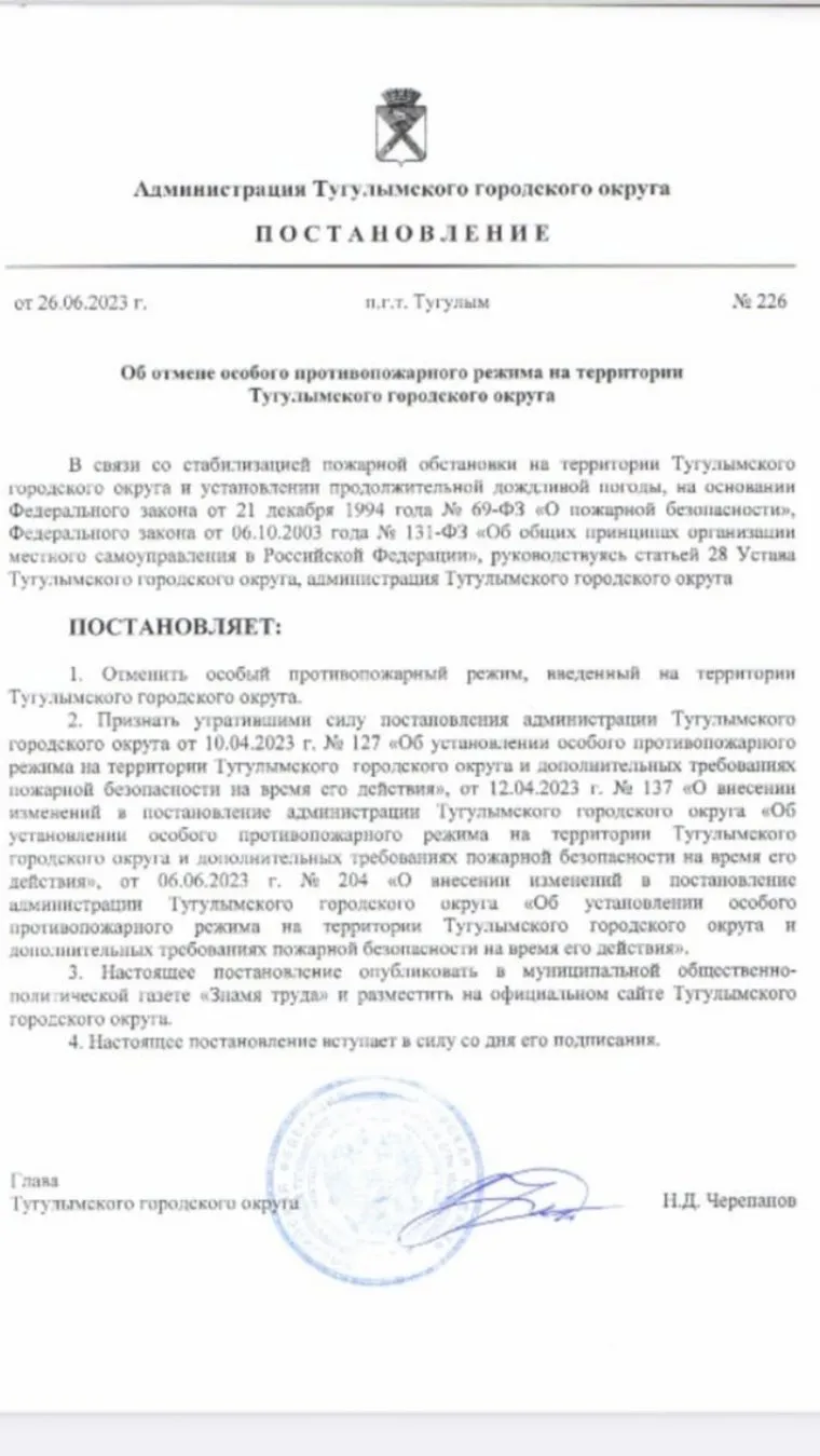 «На территории Тугулымского городского округа отменяется действие противопожарного режима. Он действовал в округе с 10 апреля», — пишет пресс-служба мэрии Тугулыма в соцсети «ВКонтакте».