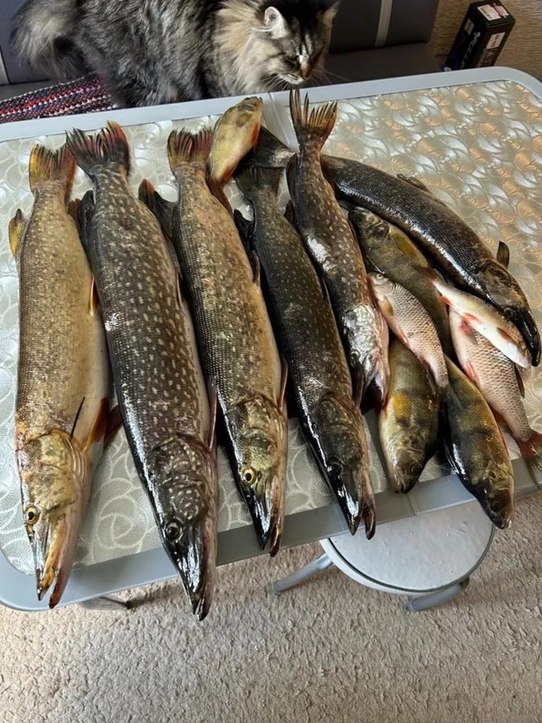 Трофеи рыбака — шесть щук, окуни и караси