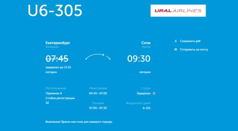 Согласно данным онлайн-табло аэропорта Кольцово, рейс U6-305 сообщением Екатеринбург — Сочи должен был состояться в 7:45 по местному времени. Ожидаемое время вылета — 13:15 часов.