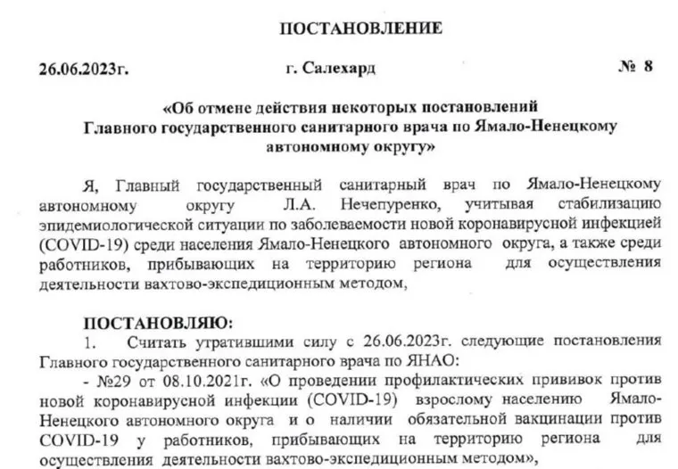«Учитывая стабилизацию эпидемиологической обстановки по заболеваемости новой коронавирусной инфекцией постановляю: считать утратившими силу требования о наличии обязательной вакцинации против COVID-19 у работников, прибывающих на территорию региона для осуществления деятельности вахтово-экспедиционным методом», — сообщается в документе, подписанном Людмилой Нечипуренко. Также отменены меры по вакцинации взрослого населения ЯНАО.