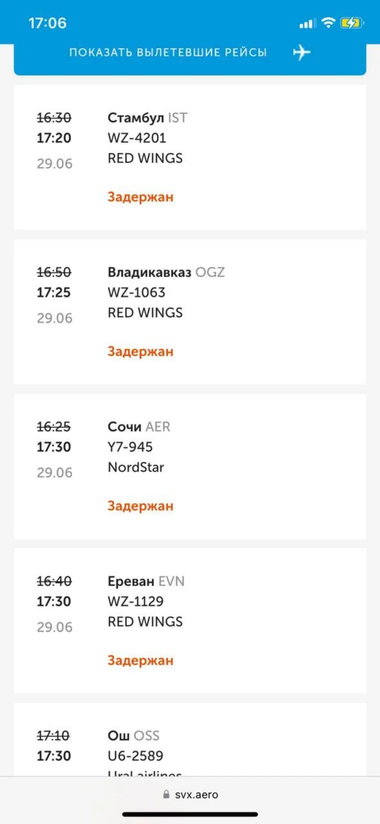 «Рейс во Владикавказ задержан на час. Также на час задержали рейсы в Стамбул, Ереван, Ош, Москву. Скорее всего, это связано с нелетной погодой», — поделились читатели агентства.