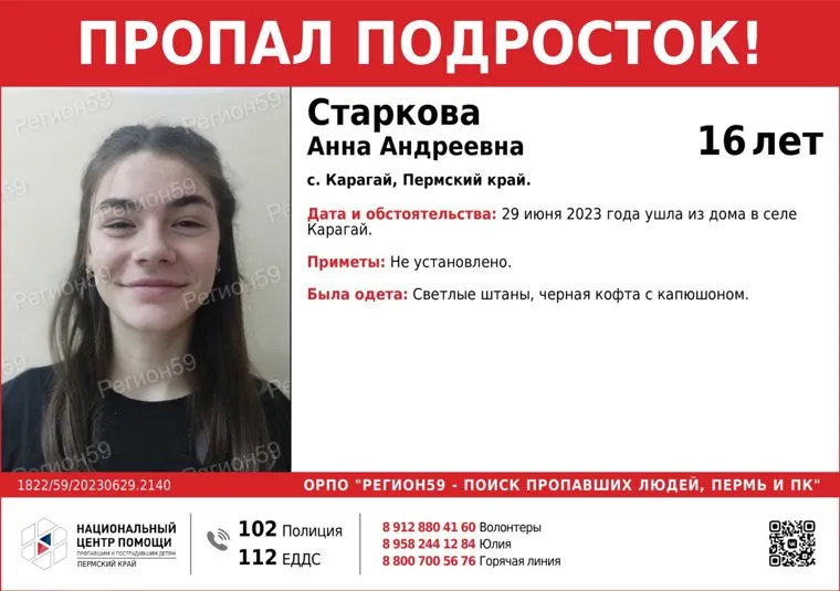 «Устанавливается местонахождение Стариковой Анны Андреевны, 16 лет, село Карагай, Пермский край. 29 июня 2023 года ушла из дома. С тех пор ее местонахождение неизвестно», — написано в telegram-канале поискового отряда «Регион 59.» Пропавшая была одета в светлые штаны и черную кофту с капюшоном, о прочих приметах не сообщается.