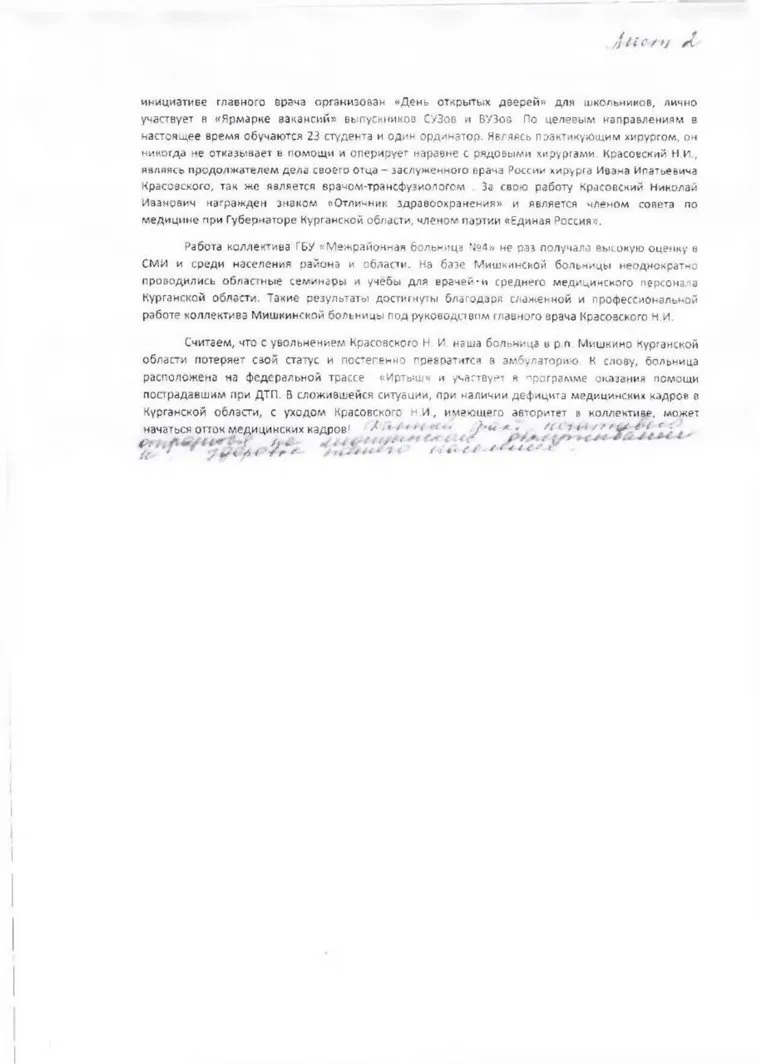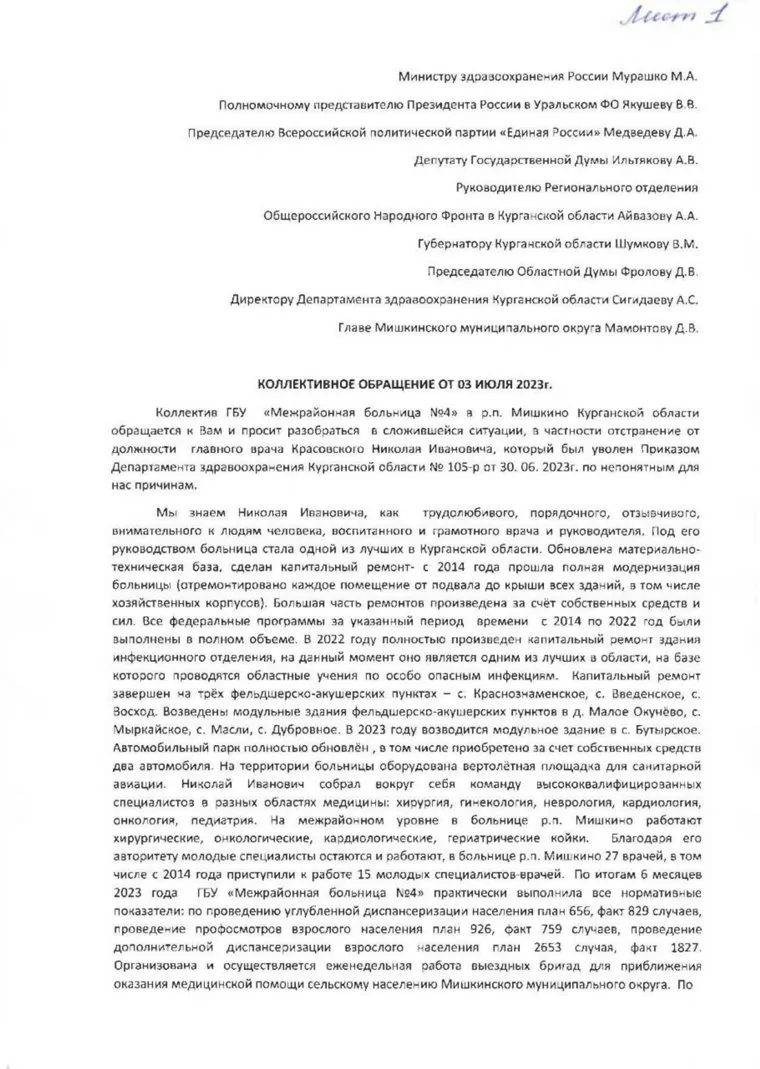 «Коллектив межрайонной больницы №4 в рабочем поселке Мишкино обращается к вам и просит разобраться в сложившейся ситуации. Главного врача Красовского Николая Ивановича уволили приказом департамента здравоохранения Курганской области от 30 июня по непонятным для нас причинам», — сказано в обращении врачей.