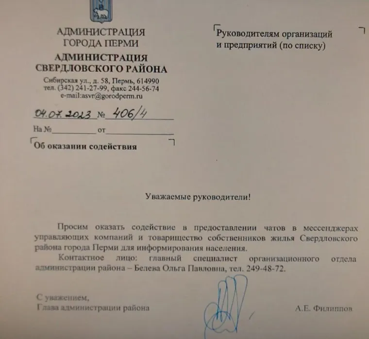 «Просим оказать содействие в предоставлении чатов в мессенджерах управляющих компаний и товариществ собственников жилья Свердловского района города Перми для информирования населения», — говорится в письме. О каком именно информировании идет речь, в письме не сообщается. Глава администрации Свердловского района Перми Александр Филиппов подтвердил URA.RU рассылку данных писем, но не уточнил, о чем чиновники будут информировать жильцов.