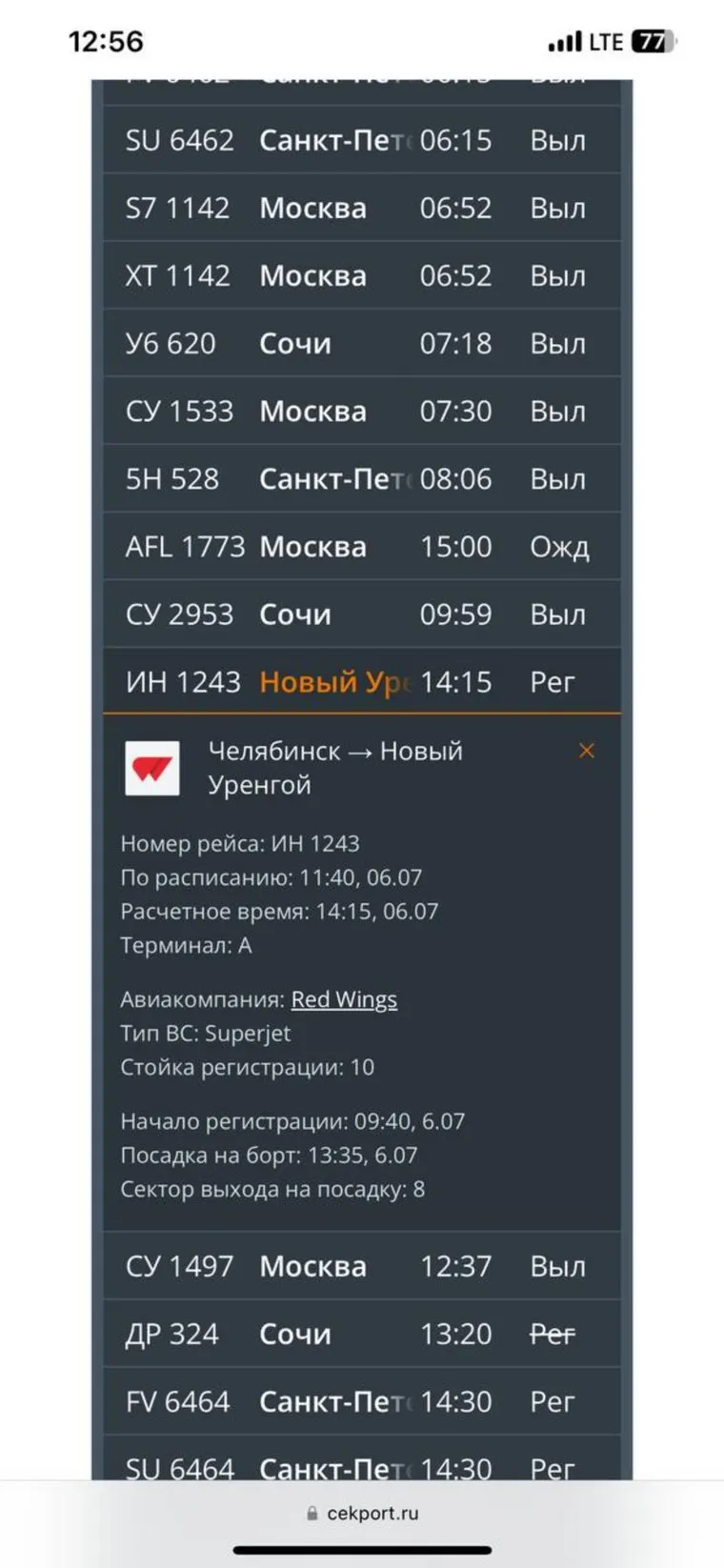 В аэропорту Челябинска три раза меняли время вылета самолета в Новый Уренгой. Скрин