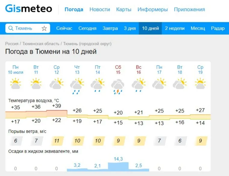«В среду, 12 июля, температура воздуха в Тюмени поднимется до +39 градусов, а затем начнет постепенно снижаться. Уже в субботу, 15 июля, столбики термометров опустятся до +20 градусов, а сильный ветер принесет в регион тучи и грозы», — говорится в сообщении.