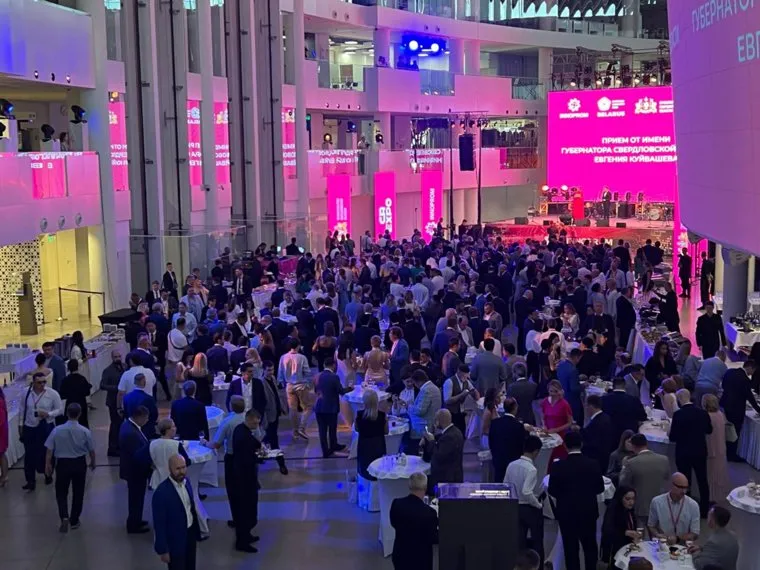 В Ельцин Центре прошел прием губернатора Евгения Куйвашева по случаю открытия международной выставки «Иннопром». В атриуме ЕЦ собрались десятки человек — в основном топ-чиновники и бизнесмены-участники форума.