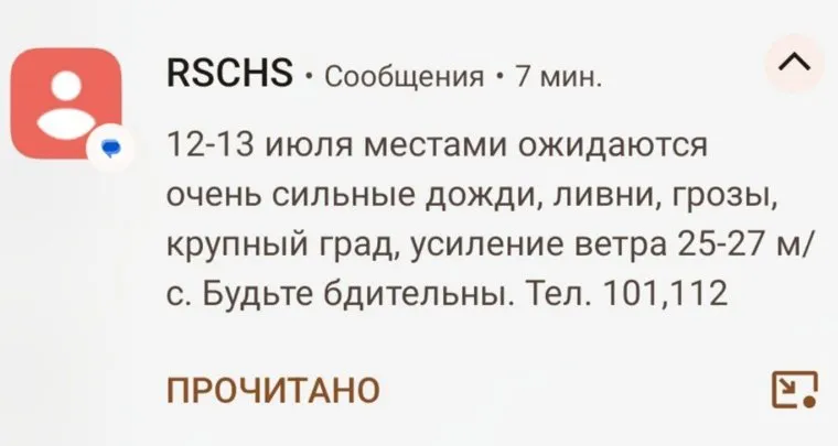 «12-13 июля местами ожидаются очень сильные дожди, ливни, грозы, крупный град, усиление ветра 25-27 метров в секунду. Будьте бдительны», — сказано в сообщении. О необходимости оказания помощи граждан просят сообщать по телефонным номерам 101 и 112.