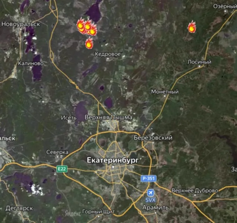 По данным с карты Научно-исследовательского института аэрокосмического мониторинга «Аэрокосмос», пожары действуют с северо-запада от Екатеринбурга возле Аятского водохранилища и поселка Лосиный. Корреспондент URA.RU отправил запрос в пресс-службу ГУ МЧС России по Свердловской области. На момент публикации ответ не был получен.