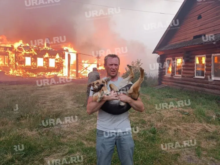 Жители объятого огнем свердловского села Шайдуриха спасают домашних питомцев. Фото с места событий поделился один из читателей URA.RU, который находится в гуще событий.