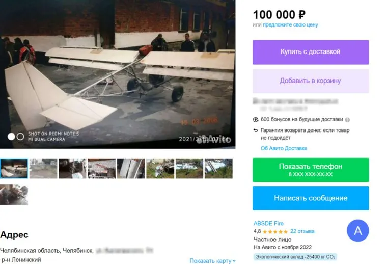 В Челябинске продают самолет за 100 тысяч рублей. Скрин