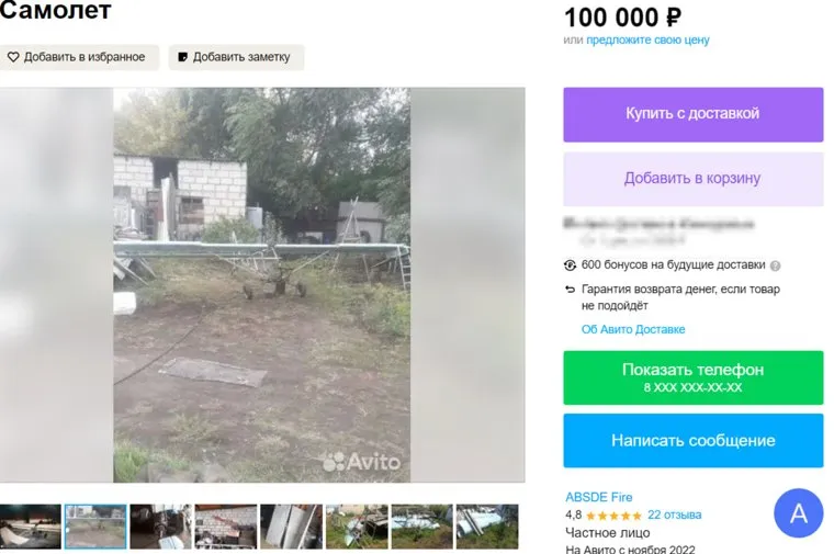 «Самолет за 100 тысяч рублей. Когда-то летал, нужна ревизия», — сообщается в объявлении на сайте «Авито».