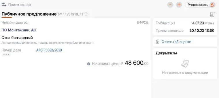 Бильярдный стол предлагается приобрести в рамках распродажи имущества компании. Начальная цена лота — 48,6 тысячи рублей. Заявки принимаются до 30 октября.