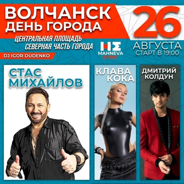 «Всех, кто хочет круто провести летний вечер и отдохнуть с друзьями под музыку популярных исполнителей, приглашаю 26 августа в Волчанск на праздник, посвященный дню города и дню шахтера. Для вас на центральной площади северной части Волчанска выступят звезды российской эстрады Стас Михайлов, Клава Кока и Дмитрий Колдун», — рассказал глава Волчанского городского округа Александр Вервейн на своей странице «Вконтакте».