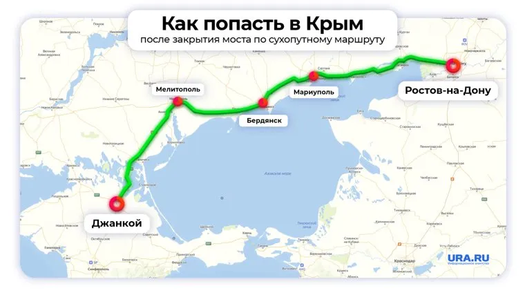 Наземный маршрут в сторону Крыма в настоящий момент начинается с Ростова-на-Дону. Водителям предстоит проехать через новые российские территории, а именно города Мариуполь и Бердянск (Донецкая народная республика), а также Мелитополь (Запорожская область). Через данный маршрут можно будет проехать до Джанкоя (город в Крыму).