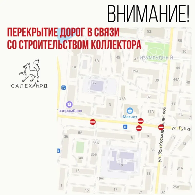 «С 17 июля по 30 июля перекрытие дорог в связи со строительством коллектора. Будьте внимательны при планировании маршрута», — сообщает в официальном telegram-канале мэрия Салехарда.