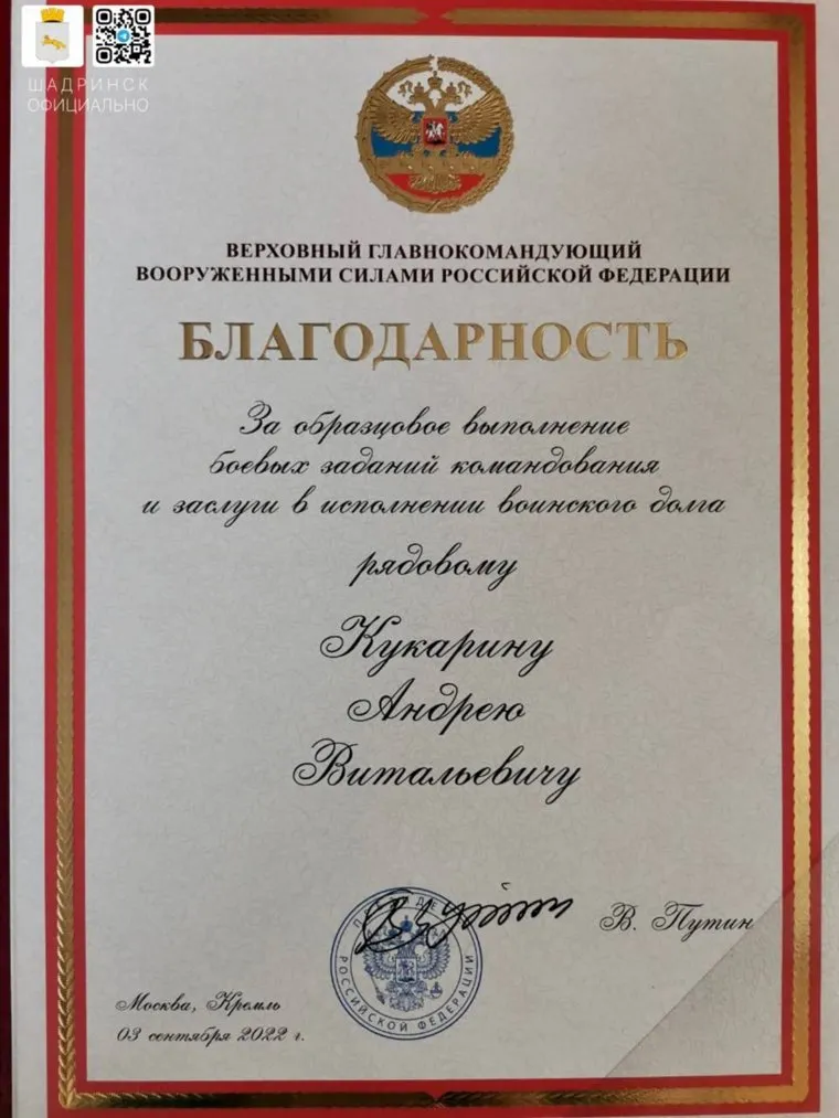 «Матери погибшего в ходе специальной военной операции рядового Андрея Кукарина сегодня в Шадринске передали благодарность Верховного главнокомандующего Вооруженными силами РФ. Такая награда от Президента страны Владимира Путина в городе вручена впервые», — сообщили в мэрии. Благодарность матери бойца вручил глава Шадринска Антон Мокан.