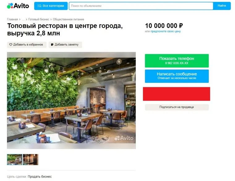 «Продается процветающий кафе-ресторан, успешно работающий на рынке уже пять лет. Продается по причине переориентации на другую сферу деятельности и переезд в другой город. Цена обсуждается индивидуально с заинтересованными покупателями», — говорится в одном из объявлений.