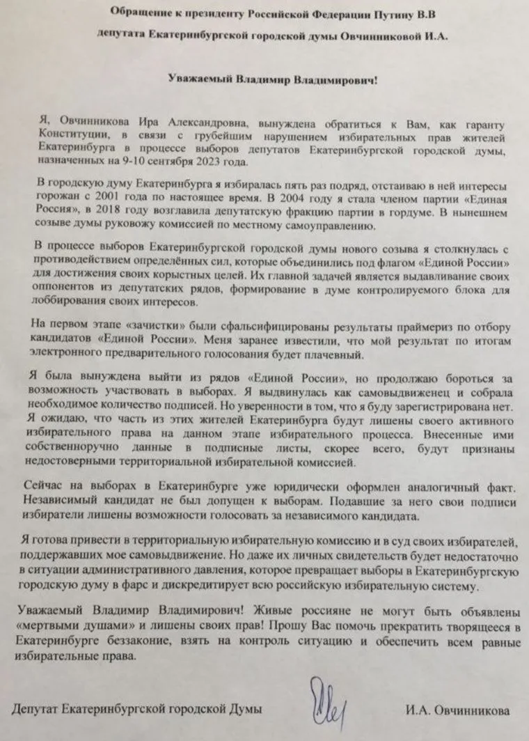 «Я была вынуждена выйти из рядов „Единой России“, но продолжаю бороться за возможность участвовать в выборах. Я выдвинулась как самовыдвиженец и собрала необходимое количество подписей. Но уверенности в том, что я буду зарегистрирована, нет. Я ожидаю, что часть из этих жителей Екатеринбурга будут лишены своего активного избирательного права на данном этапе избирательного процесса. <…> Уважаемый Владимир Владимирович! <…> Прошу Вас помочь прекратить творящееся в Екатеринбурге беззаконие, взять на контроль ситуацию и обеспечить всем равные избирательные права», — попросила Овчинникова.