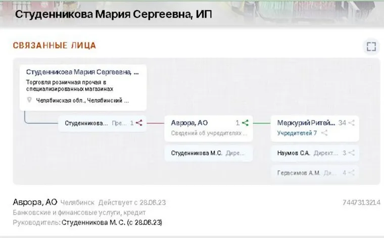 АО «Аврора» было зарегистрировано в Челябинске 28 июня 2023 года, в этот же день его руководителем стала Мария Студенникова. В состав учредителей «Меркурий Ритейл Холдинг» фирма вошла с 25 июля 2023 года. Контролируемым ей 49% акций холдинга соответствует 36 млрд рублей в его уставном капитале.