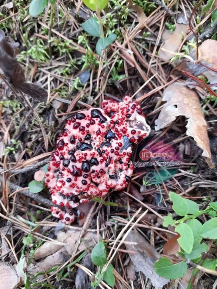 «Вот такую интересную находку нашли сегодня в лесу! Гриб называется „Кровавый зуб“», — говорится в публикации паблика «Не типичный Ханты-Мансийск» в соцсети «ВКонтакте».