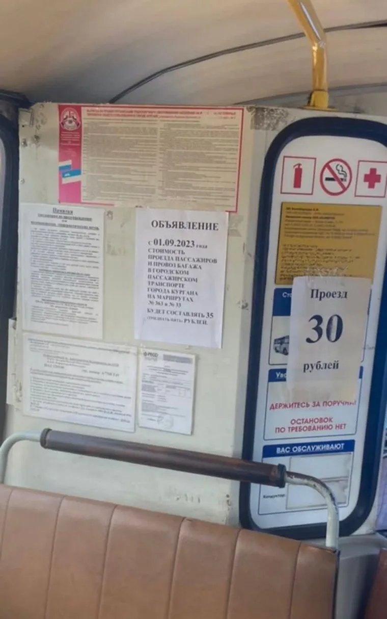 «Объявление: с 01.09.2023 года стоимость проезда пассажиров и провоз багажа в городском пассажирском транспорте города Кургана на маршрутах №363 и №33 будет составлять 35 рублей», — указано на фотографии, опубликованной в группе «О, Курган» соцсети «ВКонтакте». Объявление размещено в салоне автобуса.