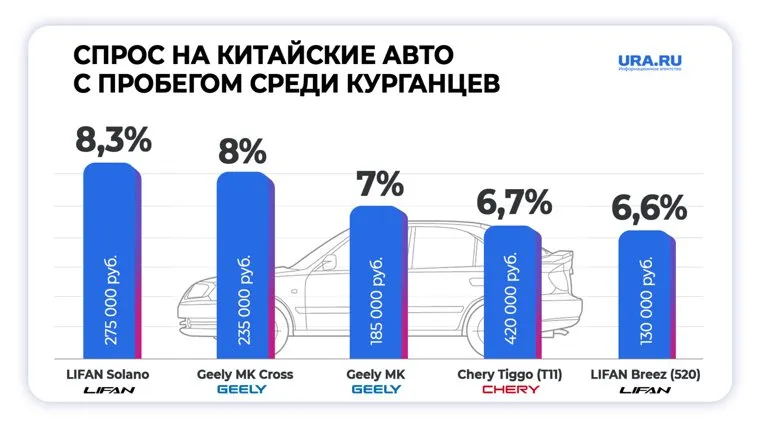 «По данным платформы, покупательский интерес к авто с пробегом китайских производителей в Курганской области за январь—июнь вырос на 15,7% в сравнении с аналогичным периодом прошлого года. Спрос на новые авто год к году увеличился на 101,9%. Средняя цена новых авто с пробегом китайских брендов — 420 000 рублей», — рассказали URA.RU эксперты.