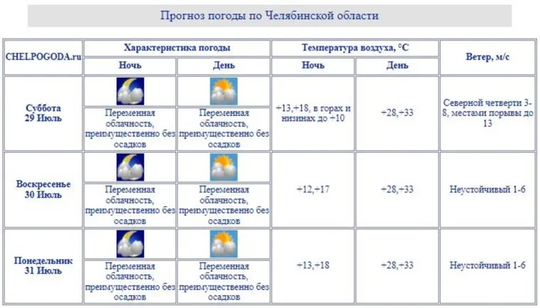 «В Челябинской области с 29 по 31 июля днем температура воздуха будет прогреваться до плюс 28—33 градусов. Ночью — опускаться до 12—18 градусов тепла, 29 июля в низинах — вплоть до плюс 10. Будет преимущественно без осадков. 29 июля порывы ветра могут достигнуть 13 метров в секунду, в другие дни скорость не превысит шести метров в секунду», — уточнили в челябинском ЦГМС.