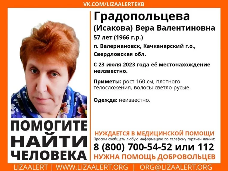В поселке Валериановск (Качканарский городской округ, Свердловская область) с 23 июля ищут 57-летнюю Веру Градопольцеву (Исакову). Об этом сообщили в поисковом отряде «ЛизаАлерт» по Свердловской области.