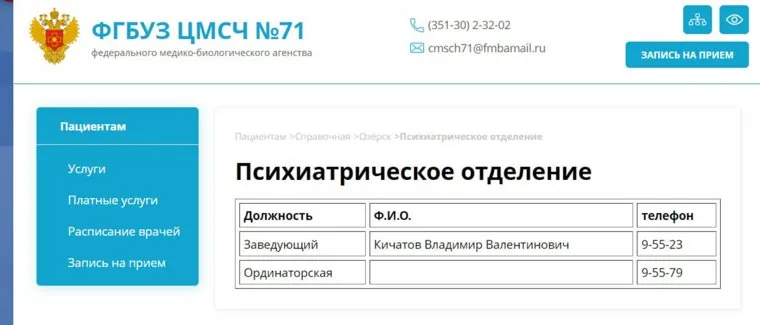 На официальном сайте ФГБУЗ КБ №71 Владимир Кичатов значится в роли заведующего психиатрическим отделением