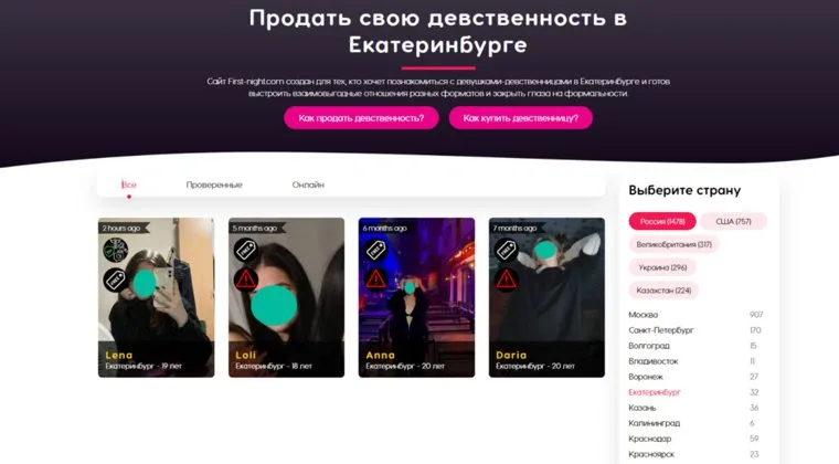 Несколько жительниц Екатеринбурга опубликовали свои анкеты на сайте по продаже девственности. Девушкам от 18 до 20 лет, за ночь с собой они просят от 1500 до 200 тысяч долларов. Некоторым нужны деньги для успешного стартапа бизнеса.