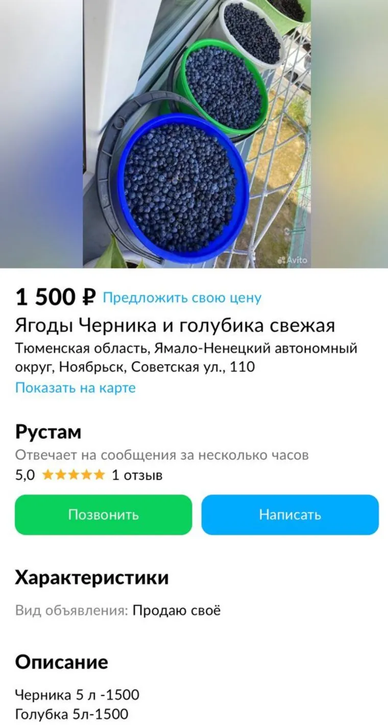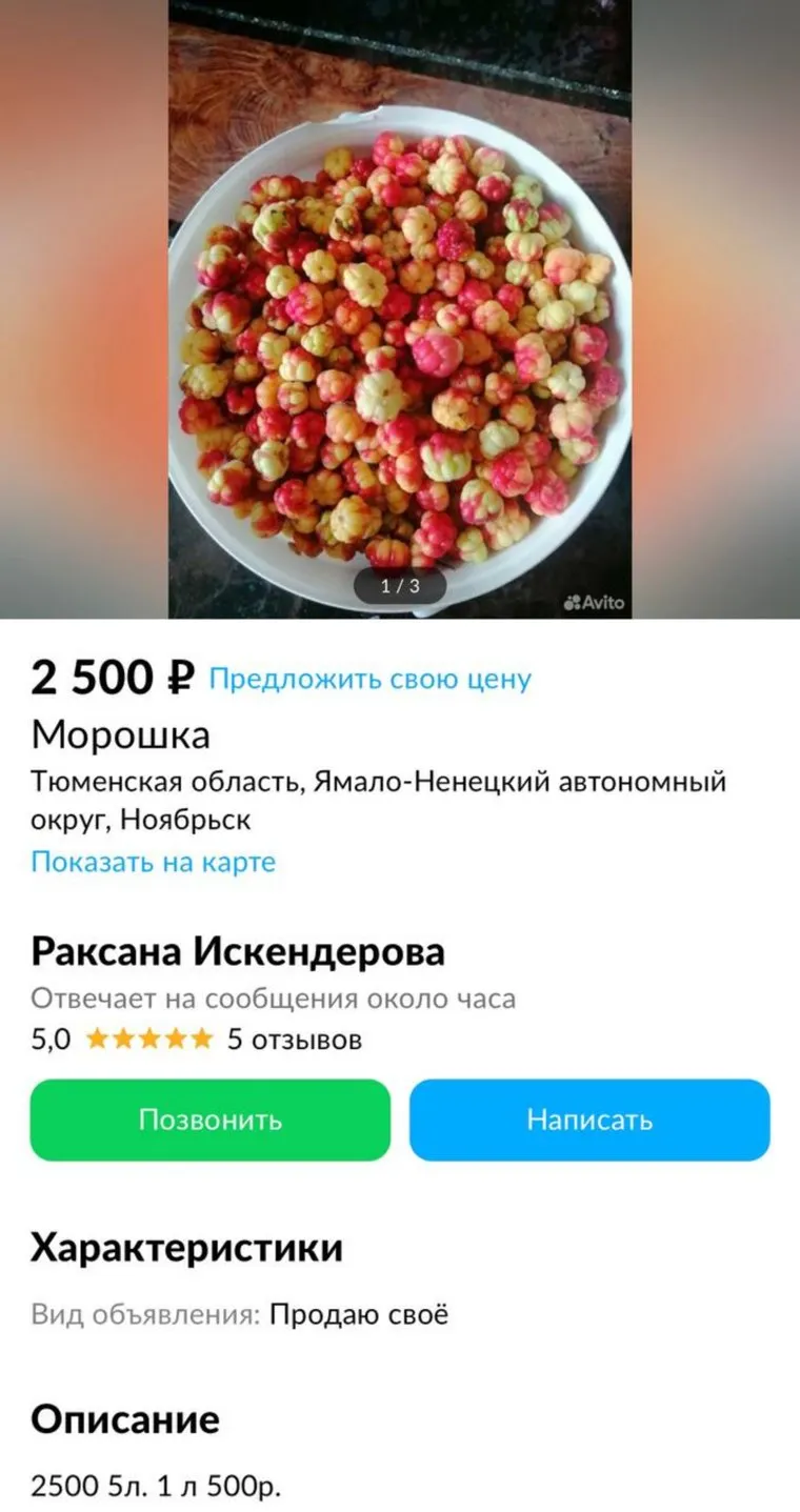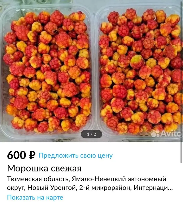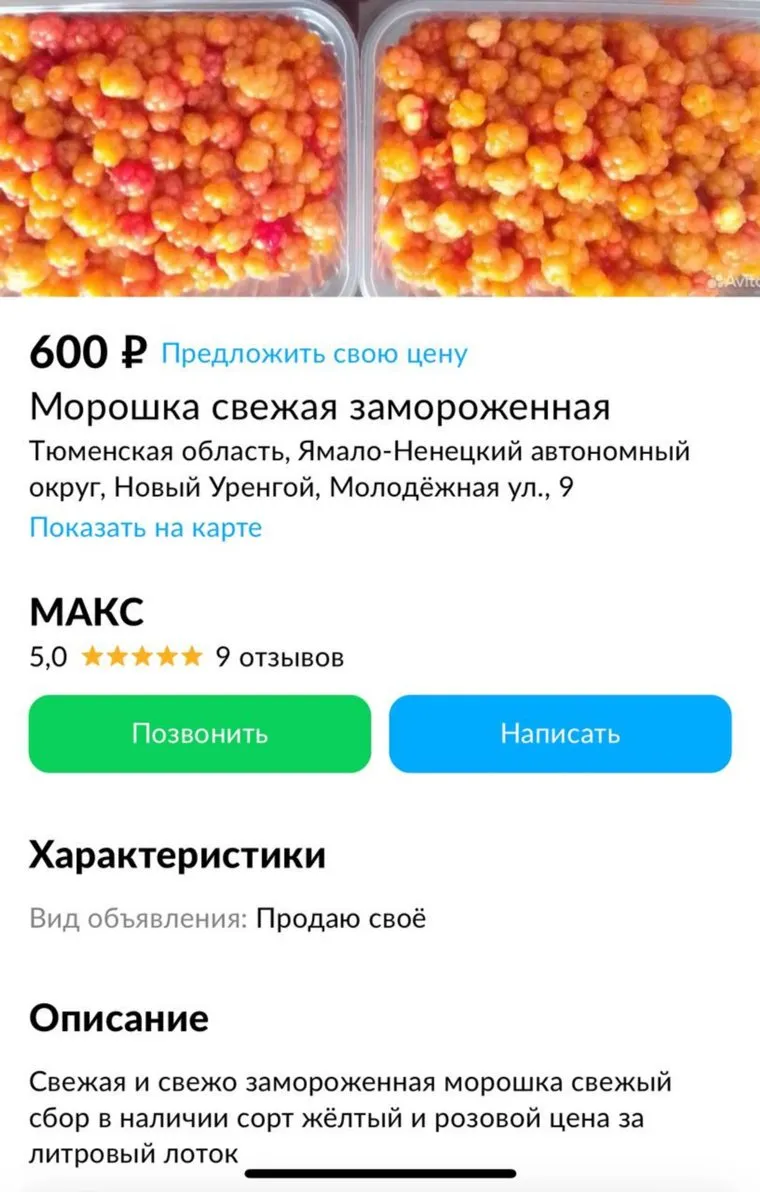 «Продам свежую морошку в Новом Уренгое. 600 рублей за литр. Бесплатная доставка по городу», — сказано в одном из объявлений.