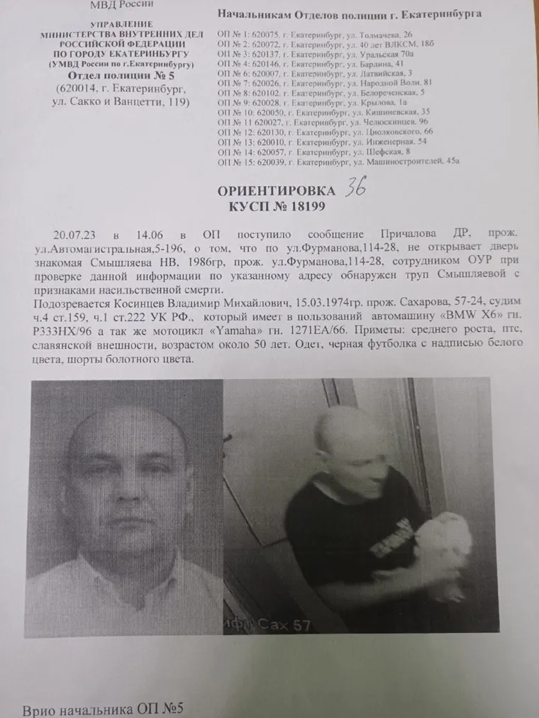 Наталья Смышляева была найдена убитой 20 июля. Смерть женщины носила криминальный характер . Близкие рассказали, что 37-летняя женщина увлекалась мотоспортом и посещала курсы в екатеринбургской мотошколе. Там, по словам друзей, ее домогался некий Владимир Косинцев — автомобилист и мотоциклист. Он несколько раз подвозил Наталью до дома. Предположительно, накануне убийства Косинцев также привез на мотоцикле женщину домой.