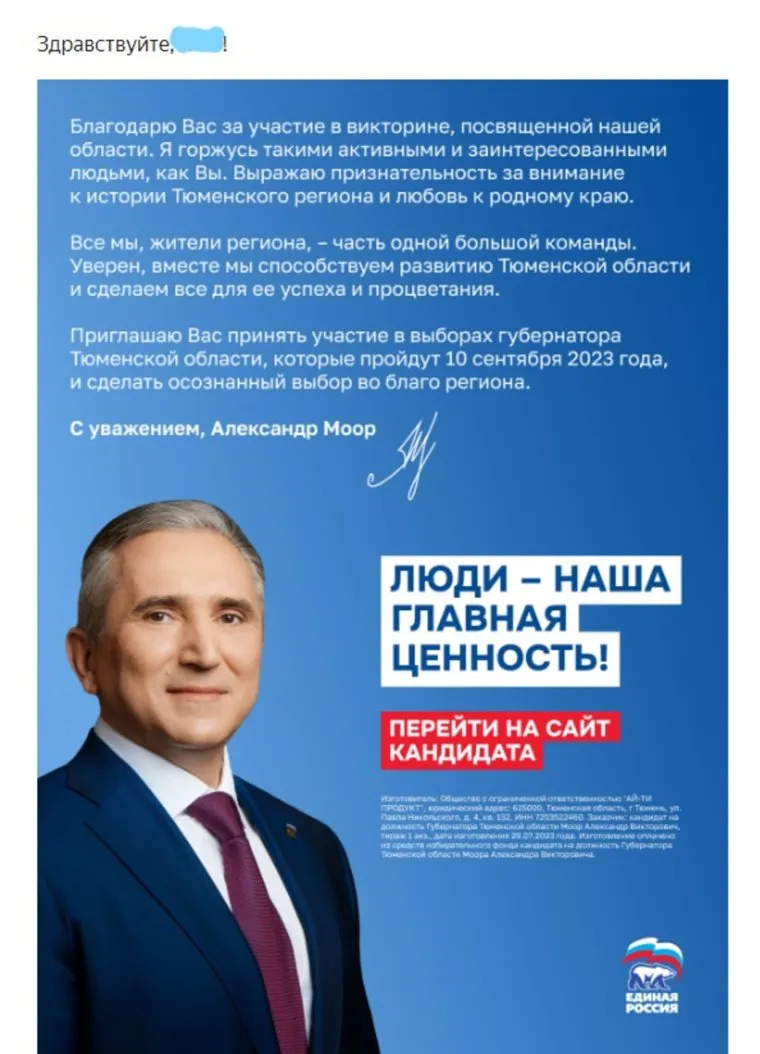 Таким способом команда Моора отошла от привычных сухих сообщений с датой выборов и информационной сводке о кандидате. Вместо этого тюменцы получают обращение от действующего губернатора. Собеседники агентства называют лишь один минус: указанный электронный адрес губернатора не принимает ответные сообщения.