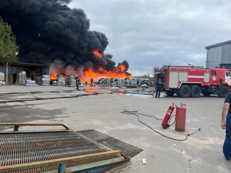 Пожар начался около 12:00 по московскому времени. Загорелись пластиковые поддоны на территории склада.