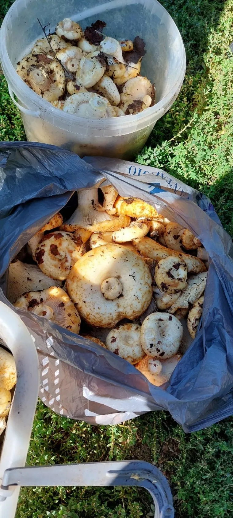 На фото видно, что Ольга собирала грибы в ведро, пакет и корзину, в основном урожай состоит из волнушек, хотя видны и другие съедобные грибы. Также ноябрянка наловила рыбы.