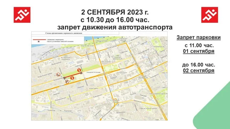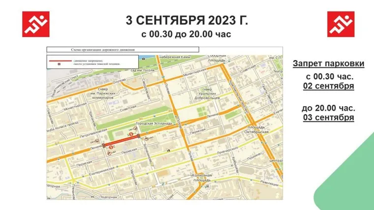 «Будет запрещена остановка и стоянка всех видов транспорта с 11:00 1 сентября до 16:30 2 сентября по улице Петропавловской от улицы Борчанинова до улицы Крисанова. Также с 23:00 1 сентября до 20:00 3 сентября по улице Ленина от улицы Борчанинова до улицы Крисанова», — указано на сайте администрации Перми.