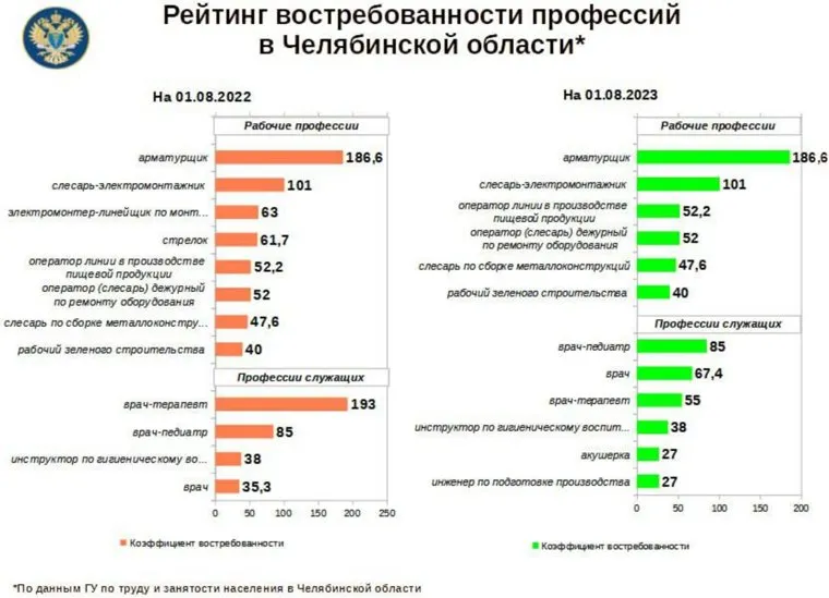 «Среди профессий служащих по коэффициенту востребованности лидируют педиатры (85), врачи (67,4), терапевты (55), инструкторы по гигиеническому воспитанию (38) и акушерки (27). При этом по отношению к аналогичному периоду 2022 года востребованность терапевтов снизилась со 193 в три раза», — рассказали URA.RU в КСП.