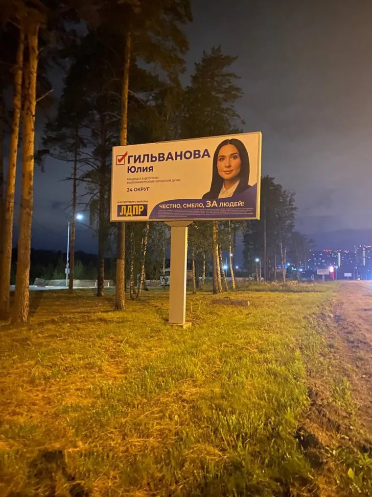 Собеседник агентства утверждает, что в округе №24 были уничтожены билборды и сити-форматы с Юлией Гильвановой (ЛДПР). Поскольку ее якобы поддерживает другая авторитетная структура, «никто не откликался на просьбы района о демонтаже конструкций», добавил источник. В 24-м округе городская власть мэрия поддерживает депутата от КПРФ Виктора Сомикова, связанного с девелопером Андреем Гавриловским. Зачистка агитации ЛДПР произошла перед визитом в Екатеринбург партийных боссов из Москвы.