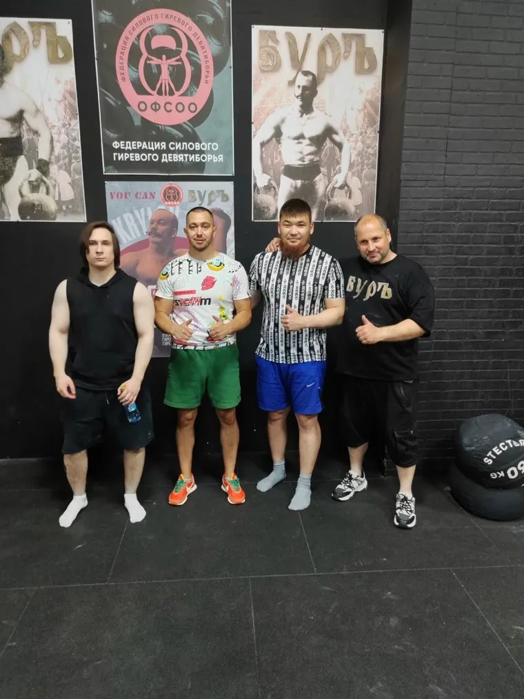Курганец Азамат Бектасов (на фото — второй справа) в силовом девятиборье поднял в сумме гири массой более 900 кг